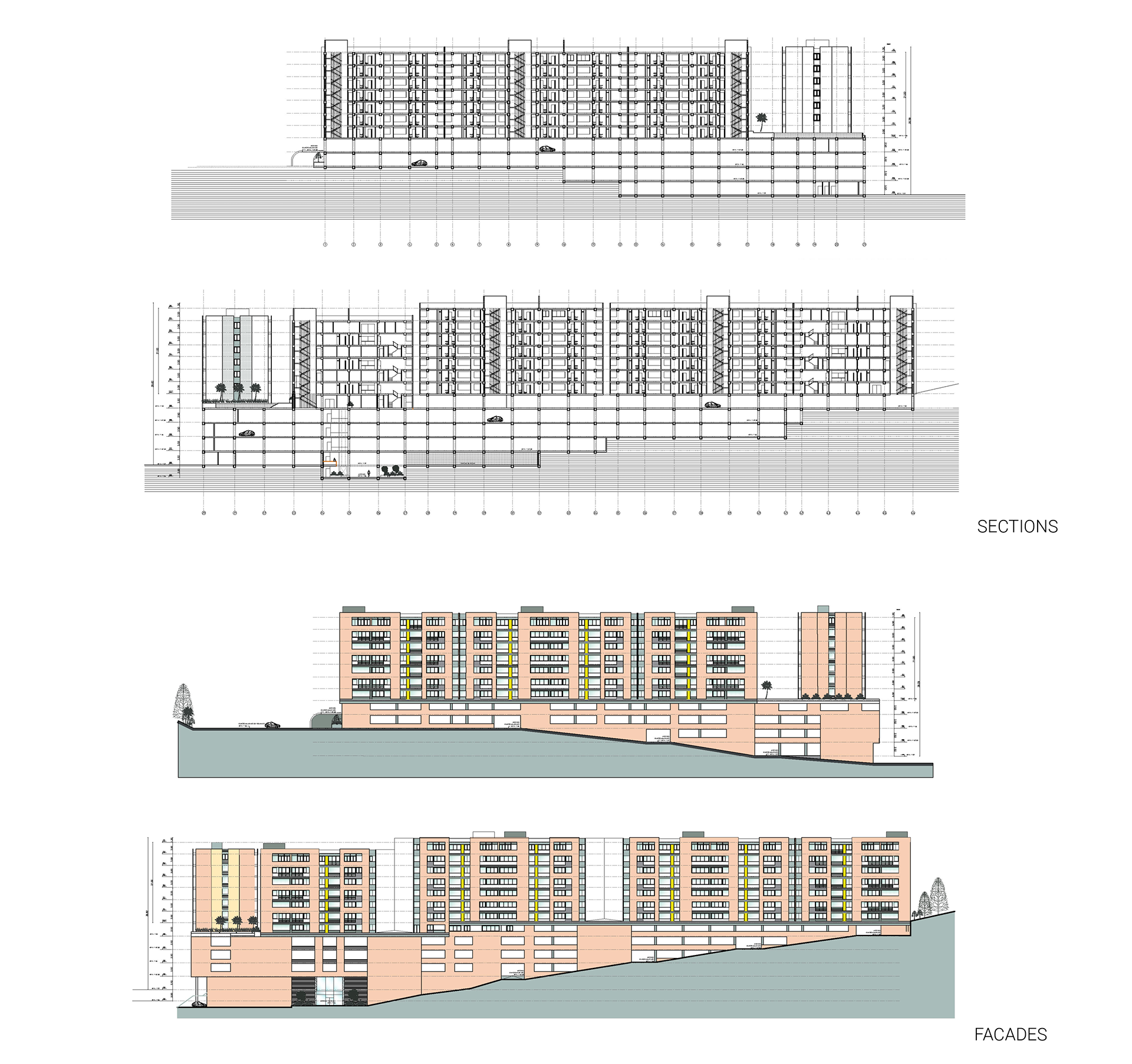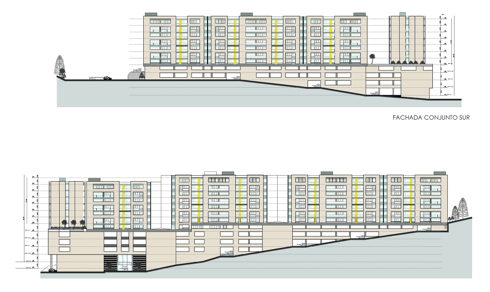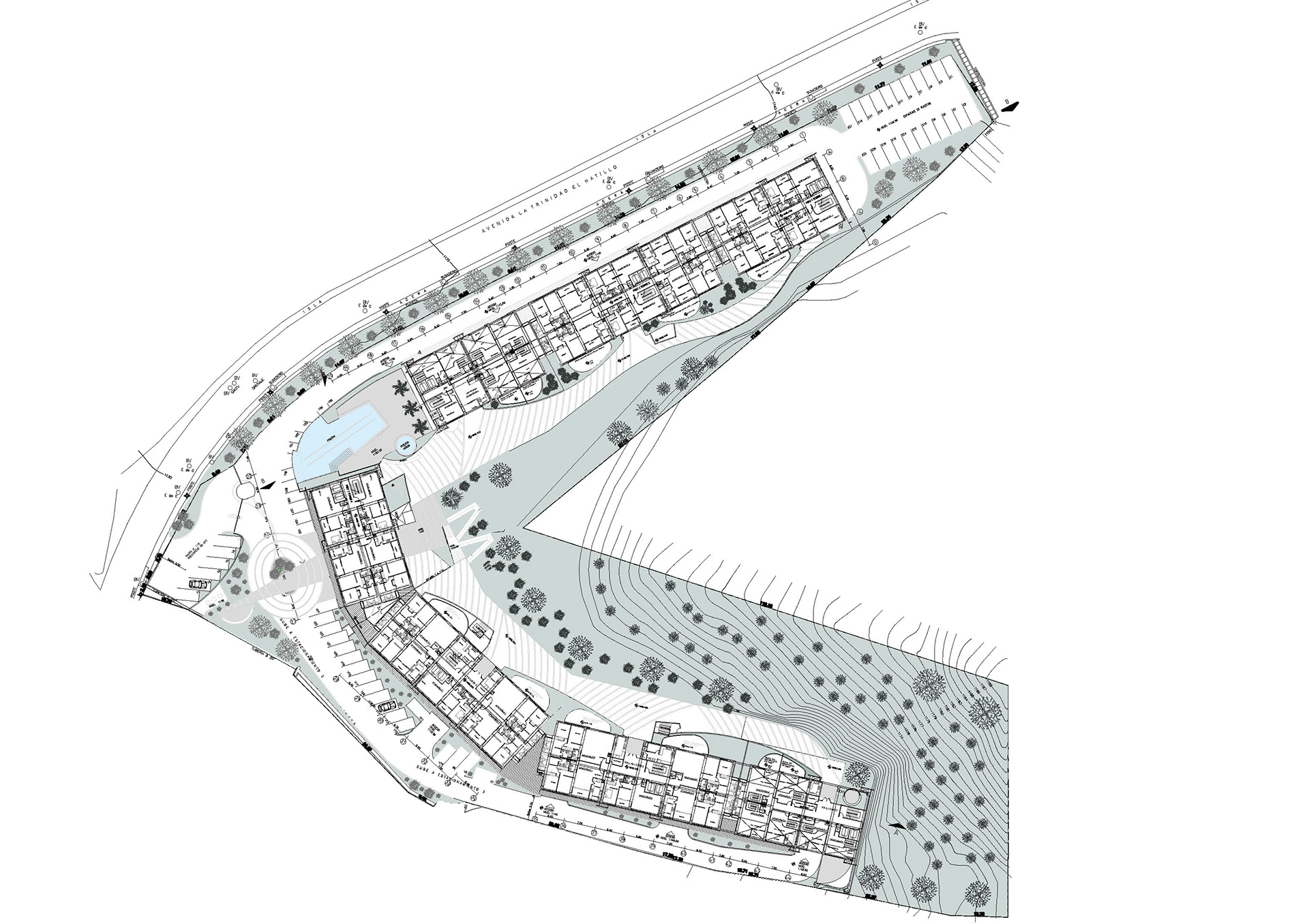 Commissioned by Arquiproyecta, this architectural collaboration focused on the design development of a residential complex featuring seven 7-story towers. The project required a highly strategic approach to site engineering, successfully integrating 2 to 5 parking levels within a very restrictive polygonal boundary.