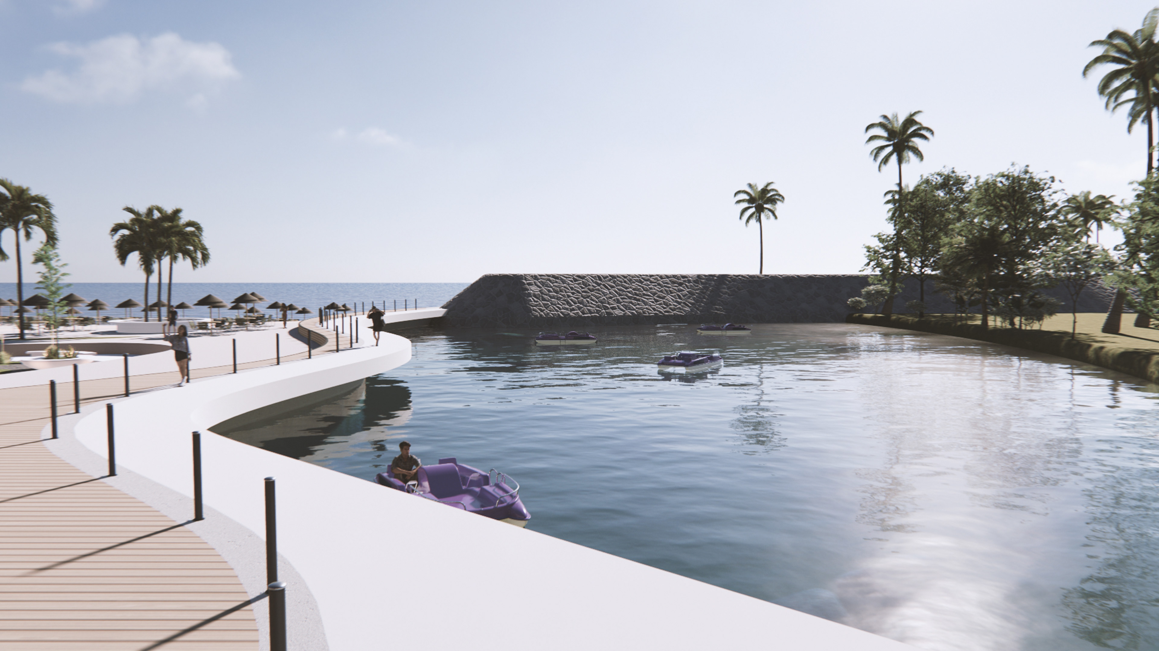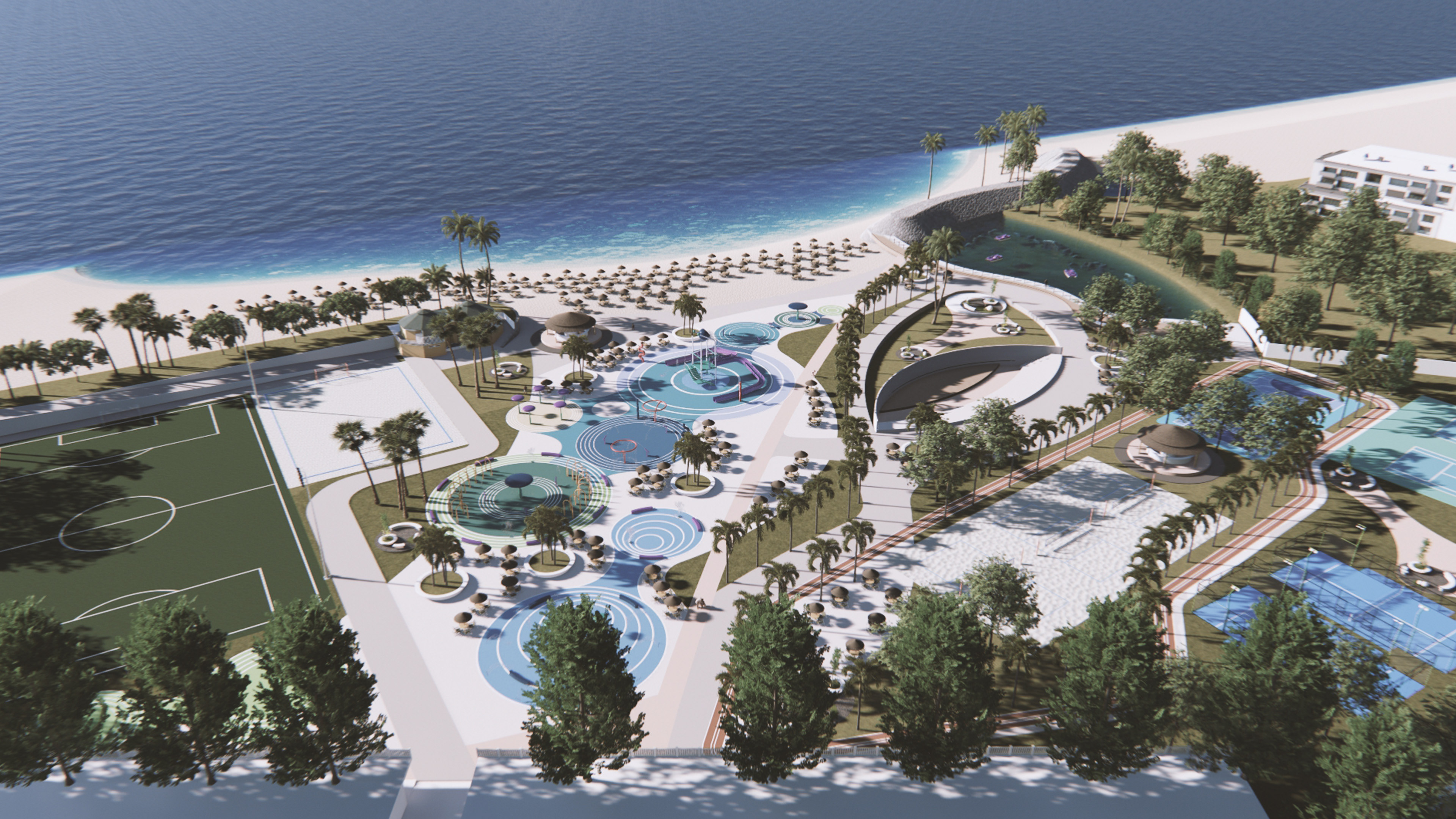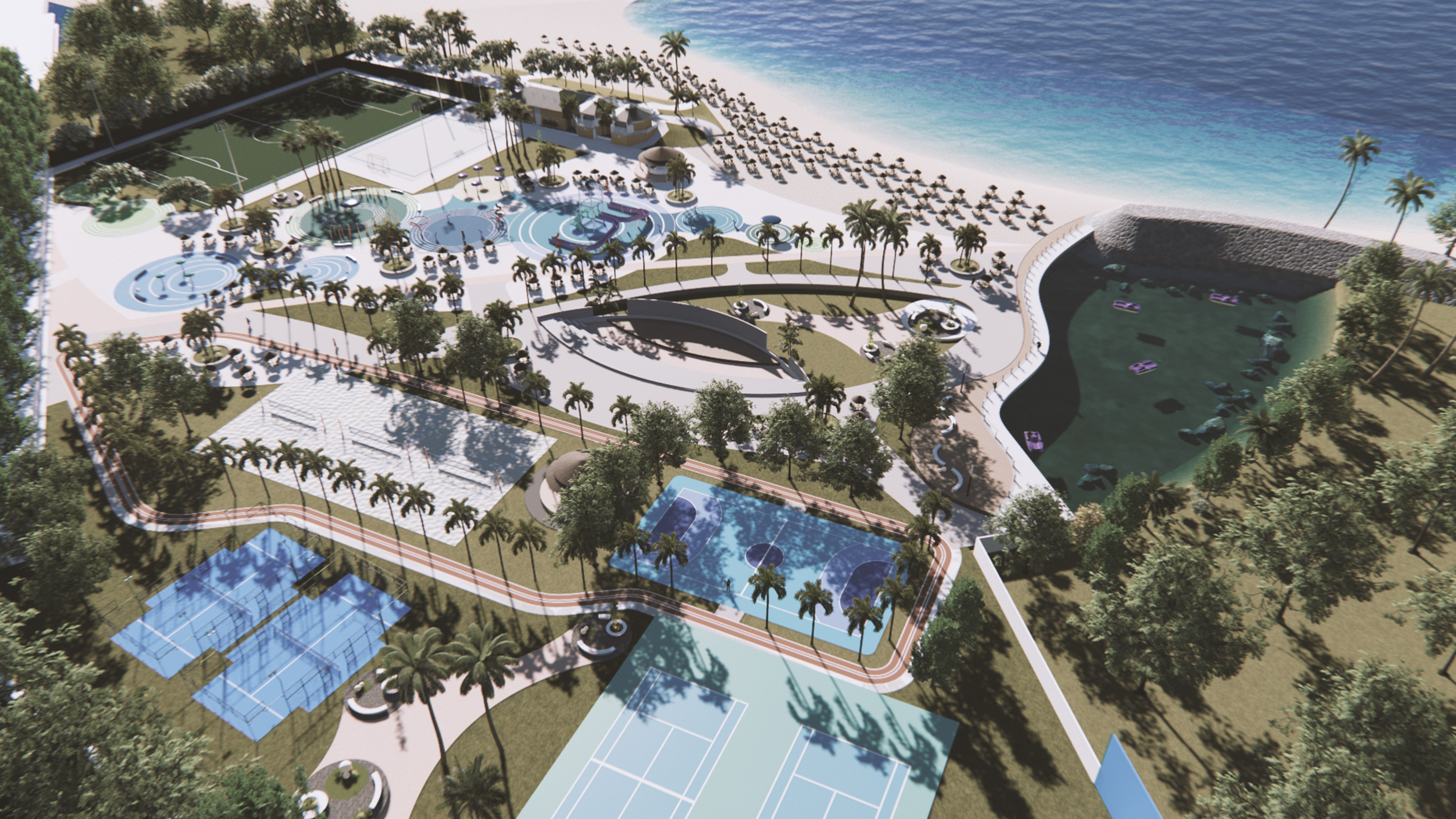 As an architectural designer, I contributed to the conceptualization and preliminary design, entire creative process and 3D visualization deliverables of a new aquatic complex at the Tanaguarena Beach Club in La Guaira, Venezuela. Working alongside ZQP Ingenieros, my role was part of a larger renovation and modernization project. The scope of the project was extensive and included a new aquatic complex and splash park, the renovation of existing sports courts for football, beach volleyball, and tennis, the integration of a new running track, playgrounds, and recreational areas to connect the club facilities with the beach, the design of an amphitheatre and a bar/juice bar called "La Churuata" to serve the club's amenities, the creation of an artificial lagoon, and the modernization of existing service areas, like storage and restrooms. My work focused on shaping the initial ideas and bringing the vision for this comprehensive aquatic and recreational park to life. In addition to the design of the complex.